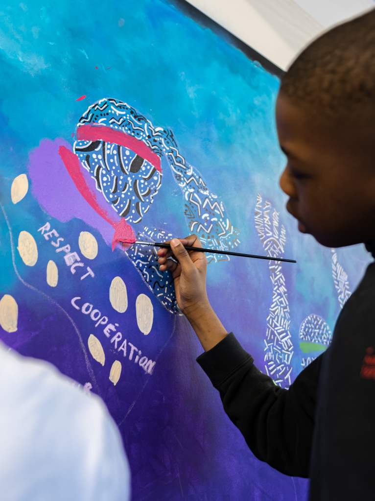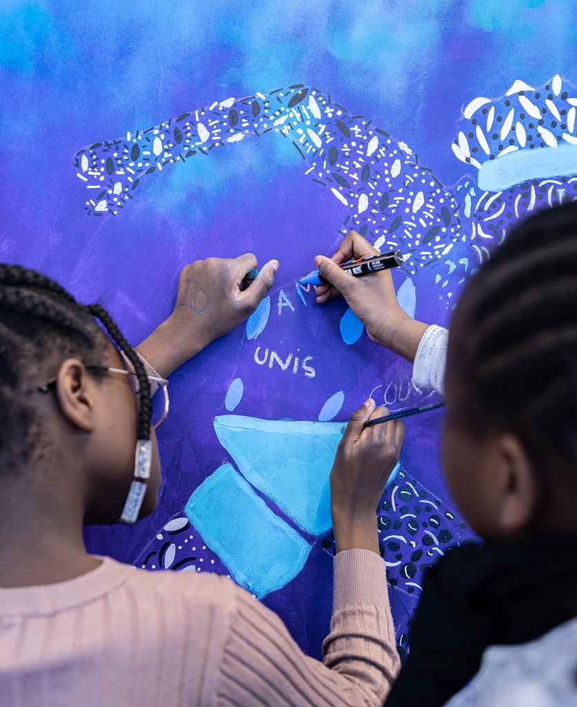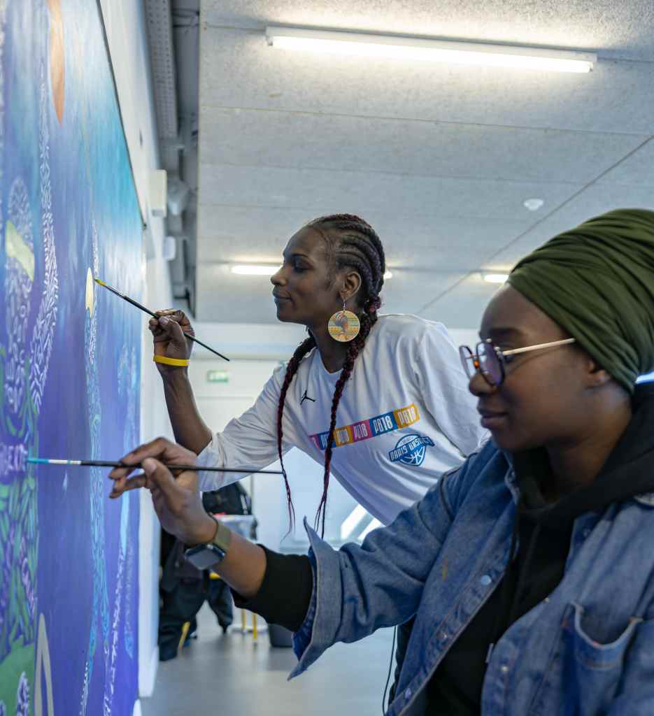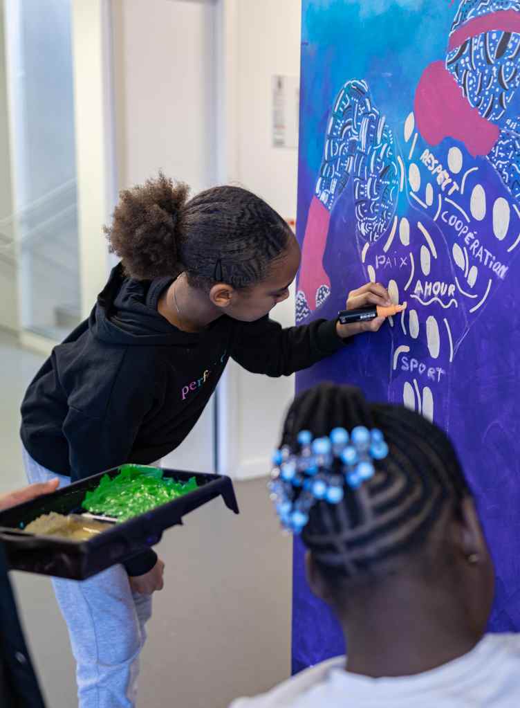 Mentorés par l’artiste Saly D. (@saly.d_art), artiste peintre plasticienne, les élèves ont passé deux jours à représenter l’impact que peut avoir le sport sur le développement et la cohésion sociale.